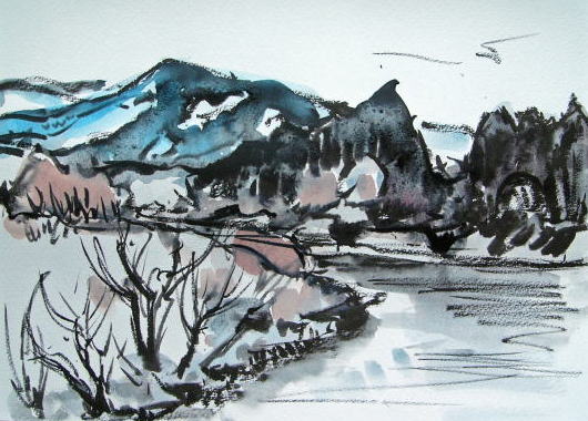 hs-052 春待つ最上川風景(村山市大槙) A4大 2010.03.03 (筆ペン、水彩)