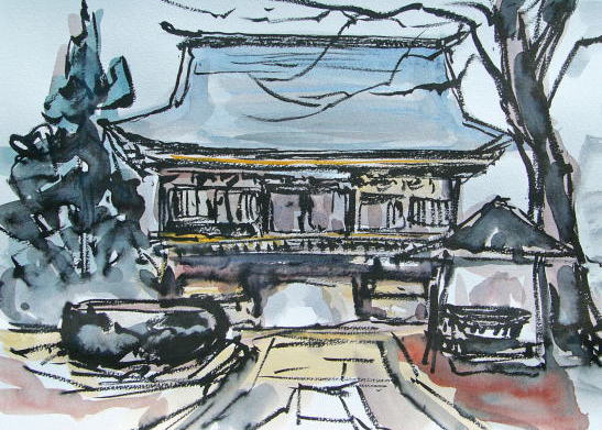 hs-054 早春慈恩寺山門風景 A4大 2010.03.22 (筆ペン、水彩)