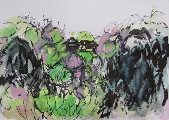 hs-062 新緑山寺風景 A4大 2010.05.20 (筆ペン、水彩)