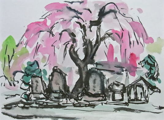 hs-088 花咲くしだれ桜(天童市上萩野戸) A4大 2011.05.02 (筆ペン、水彩)
