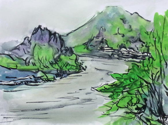 hs-099 新緑最上川風景(朝日町川通) A4大 2011.05.17 (筆ペン、水彩)