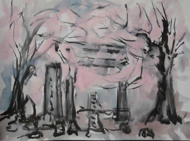 hs-295 両所神社桜風景 A4大 2015.04.27 (筆ペン、水彩)