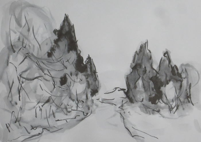 hs-705 雪止んで(大淀への雪道) 2023.01.08 (筆ペン、水彩)