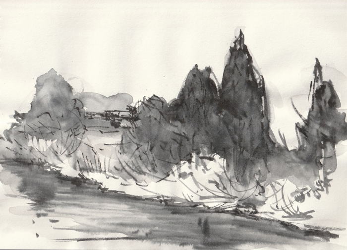 hs-822 春待つ最上川風景 2024.02.14 (筆ペン、水彩)