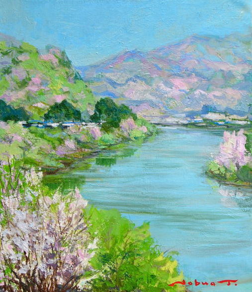 山桜咲く最上川風景....。朝日町今平(こんぺい)地区の風景をモチーフとしている。