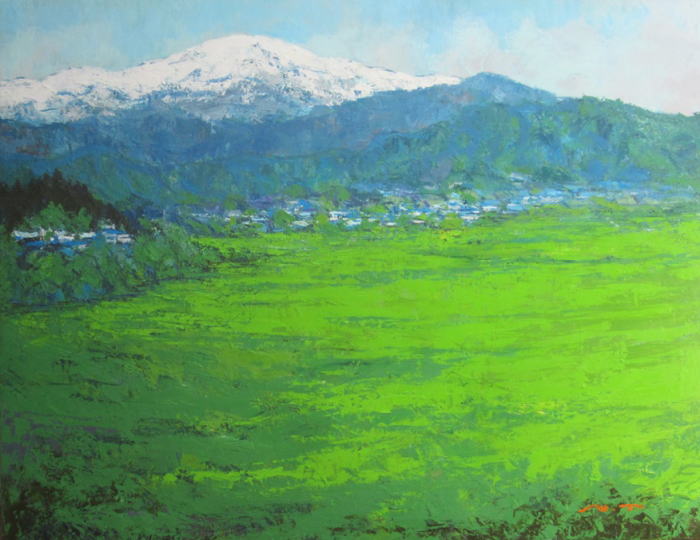 田植えも一段落、初夏の一風景。いつもの通り、ナイフで描いた緑の風景。